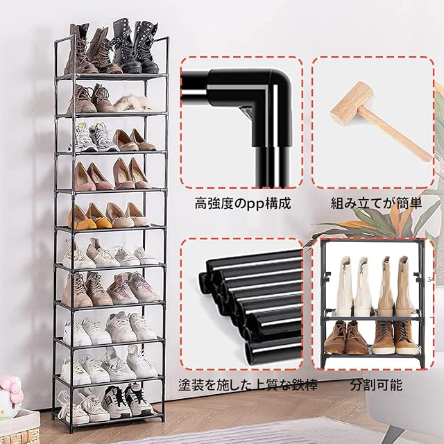 【シューズラック 丈夫でしっかりとしている】この靴ラックは塗装を施した上質な鉄棒と防水ラミネート加工不織布が使われています。①シューズラック 鋼管-直径13mmのプラスチック 塗装を施した上質な鉄棒は、錆びることがなく、腐食してしまうこともありません。②防水ラミネート加工不織布-防水仕様で通気性も良く、洗濯しやすく、長く使用することができます。③しゅーずらっく 高強度環境配慮型PPプラスチックコネクタ-耐久性があります、変形しにくいです。 【省スペース 大容量のシューズラック ブラック】サイズ:幅約45×奥行30×高さ176cm,靴ラックは、全10段で、靴を18-20足収納できます。収納スペースが狭く、靴が多い方に、この靴ラックは非常に好適です。フットプリントが小さいため、靴ラックはスペース効率が非常に高く、すべてのコーナーに適しています。 【多目的用途シューズラックに適しています】普通の収納ラックとしても使用できます。リビングルーム、寝室、キッチンなどにも適用します。雑誌、ぬいぐるみ、衣類、スナック、鉢植えなどの収納も適用!同時に玄関、寝室、キッチン、バスルームなどの場所に置くことができ、部屋をすっきり見せます。 【シューズラック 省スペース】最大16-20足収納可能。スリムなので、限られたスペースの玄関でも、空間を圧迫せずにたくさんの靴を収納できます。扉や壁がないので通気性も良く、湿気やニオイがこもりません。 【棚数を自由に調節可能】Diy自由自在に組み立て、棚板を1枚取り付けなければ、靴を入れることができます。シューズラックの高さを自由に調整できるので、靴の数によって2個5層、10層までお好みによって自由に組み合わせることができます。お好みに応じて自由に組み立てられます。 【シューズラック 組み立て簡単、分解容易】軽量且つ取り外すも可能で、引っ越しする時はすごく便利です。組立はあまり力を要らず、工具も不要な,女性の方でも手軽に組み立てることができます!日本語説明書付き
