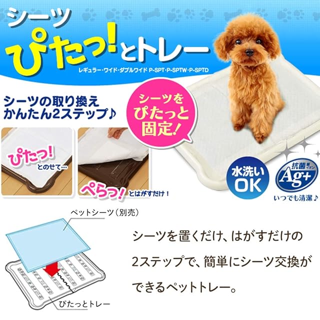 【商品説明】:シーツを置くだけ、はがすだけの2ステップで、簡単にシーツ交換ができるペットトレーです。 トレーについている粘着材がシーツをしっかり固定するので、従来の上枠が不要になりました。 水洗いが可能なので、ごみが付いても洗って繰り返し使えます。 ワイド・ダブルワイドサイズは半分に折って壁ありトイレとしても使用できます。 トレーの中央部分にも粘着材があり、シーツを固定できるため、経済的なハーフシーツの複数使いにも最適です。 ●商品サイズ(cm) ワイド:幅約48×奥行約63×高さ約2.65 ●適合シーツサイズ ワイド/ワイドサイズ:1枚、レギュラーサイズ:2枚、ハーフサイズ:4枚 ●材質 本体:ポリプロピレン ゴム足:エラストマー 粘着材:熱可塑性エラストマー ●重量 ワイド:967g