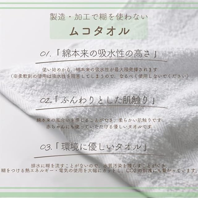 【人のお肌と環境に気づかったムコタオル】ムコタオル(=無糊タオル)は、製造工程で糊を使用しないで作りました。一般的なタオルは綿糸に糊をコーティングしないと織ることができないが、新田タオルは糊を付けずに織ることができます。その工程を省くことで綿本来の優れた吸水性と風合いを保ち、一般的なタオルに比べて、ソフトな風合いに仕上がっています。
