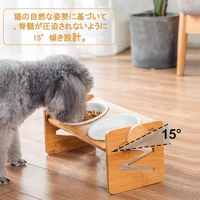 Kito Lee猫 犬用 食器 ペット食器台 猫 犬用 フードボウル 水ボウル 陶器皿250ML*2個 傾斜15度 頸椎を保護 天然竹 高さ調節可能 4段階 滑り止めパッド付き