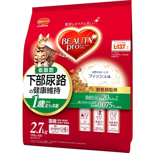 商品名:ビューティープロ キャットフード 下部尿路の健康維持 低脂肪 1歳から フィッシュ味 2.7kg 【国産】 【獣医師監修】 【小分包装】