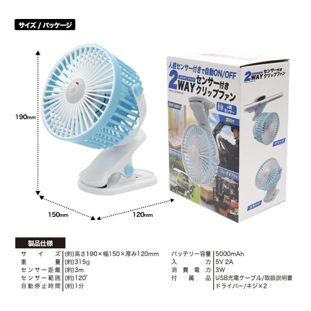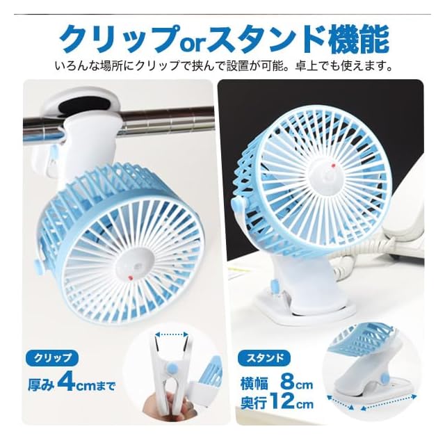 ■人感センサー付きで自動ON/OFF!<br>人を感知して自動でON/OFF!<br>センサー範囲から人がいなくなると、約1分後に運動をストップします。<br>フォークリフトやトラックの車内、脱衣所やキッチンなど、<br>熱がこもりやすい場所にぴったり!自動的に暑い場所を涼しくします。<br>※光が強いとセンサーが正常に動作しない場合があります。<br><br>■360°回転&180°回転! <br>横360°回転&縦180°回転可能。風を送る向きを自由に調節できます。<br><br>■3段階風量調整! <br>好みに合わせて3段階(弱・中・強)の風量調整が可能!<br>電源ボタンを押す回数でモードが切り替わります。<br><br>■充電式でどこでも使える! <br>付属のUSB充電ケーブルを使用し、USB充電が可能です。<br>充電式なのでどこでも使用可能です。<br><br>■クリップorスタンド機能!<br>いろんな場所にクリップで挟んで設置が可能。卓上でも使えます。<br><br>■選べる2色!<br>ピンクとブルーの2色からお選び頂けます。<br><br>