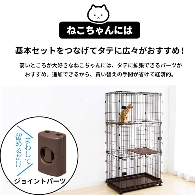 ※猫にご使用の際は必ず別売品の屋根をご使用ください。※本品を拡張する際は別売品が必要です。また、3段までかさねて使用できます。※ペットの年齢や種類・性格・個体差により、線材のすき間にはさまったり、逃げてしまうおそれがあります。十分に注意してご使用ください。