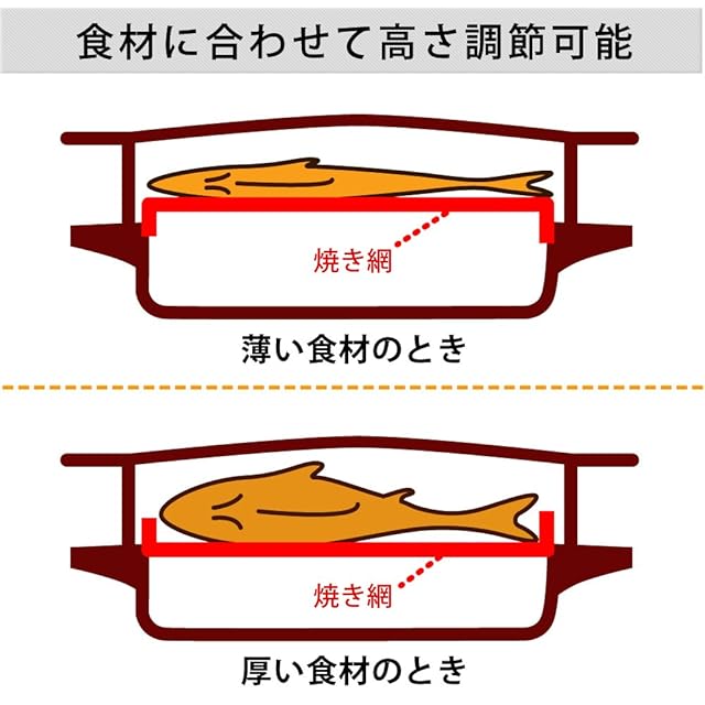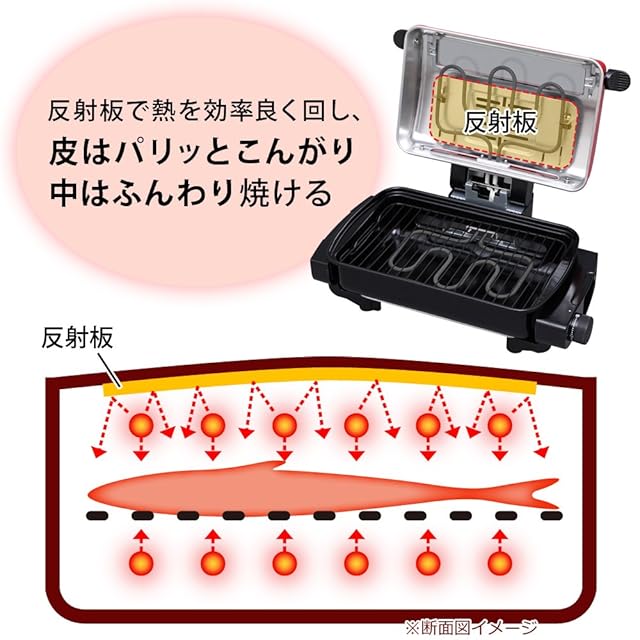 焼き網サイズ(cm):幅約34.8×奥行約21.5 コードの長さ:約1.5m 主要材質:ふた/アルミニウム、ガラス窓/耐熱強化ガラス、取っ手・本体/フェノール樹脂、焼き網/ステンレス、水受け皿/スチール