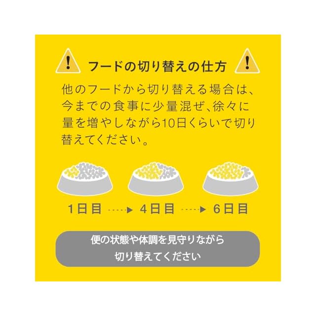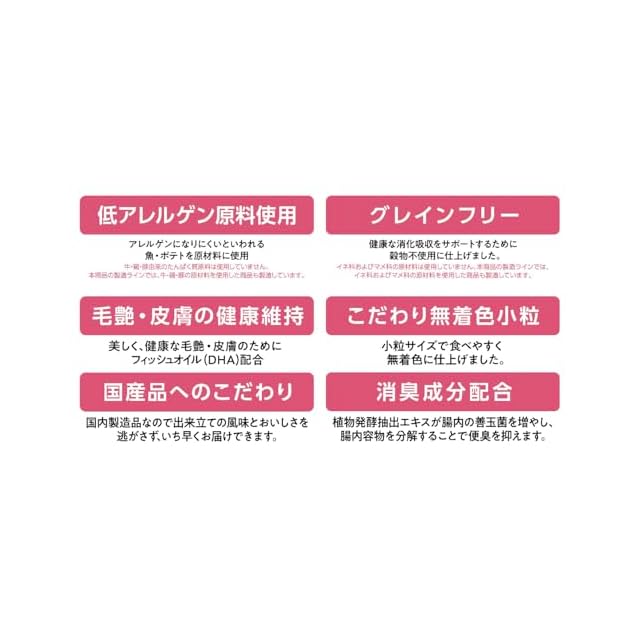 原材料名:肉類(チキンミール、ミートミール、チキンレバーパウダー)、でん粉類(馬鈴薯でん粉、タピオカでん粉)、甘藷ミール、油脂類(植物性油脂、動物性油脂、フィッシュオイル(DHA源として))、ビール酵母、セルロース粉末(食物繊維源として)、ミルクエキス、フィッシュパウダー、殺菌乳酸菌、酵母細胞壁(オリゴ糖源として)、クランベリーパウダー、納豆菌、植物発酵抽出エキス、ミネラル類(カルシウム、リン、カリウム、塩化ナトリウム、亜鉛、鉄、銅、ヨウ素)、ビタミン類(A、D、E、B2、B12、パントテン酸、コリン)、メチオニン、酪酸菌