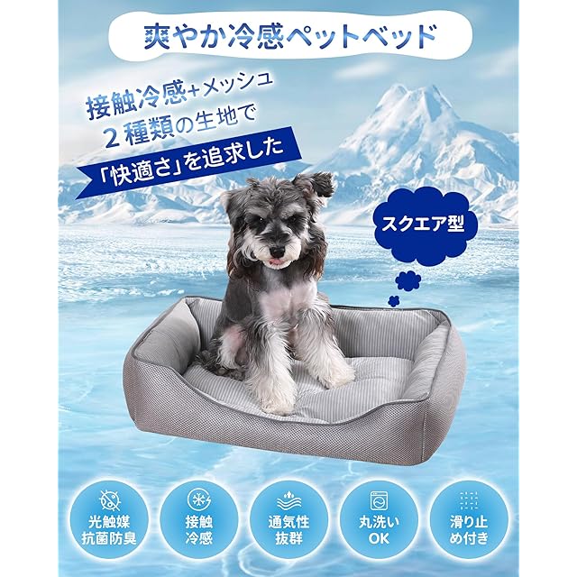 【二重織複合冷感生地使用】愛犬・愛猫の睡眠と健康を守るための夏用クールペットベッドです。冷感寝具シリーズと同じ極冷感素材を使用した猫ベッド・犬ベッドで、ペットも快適に夏を涼しく過ごせます。従来の冷感素材よりも強度があり、優れた耐摩耗性が備わるポリエチレンxナイロン生地を使用することで、さらに蒸れを抑え、汗をかいてもサッと吸い取ってくれています。暑さに弱い犬や猫にはピッタリ、熱中症対策品としてもご使用いただけます。外側は3Dメッシュ生地で通気性UP。3Dメッシュ生地で熱や湿気などを逃し、朝までサラサラムレにくい寝心地。夏用のペットベッドにピッタリです。