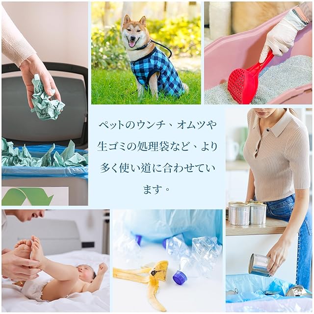 【汎用性】犬や猫のうんち(お散歩中にも)、ペット用オシッコシート、猫砂など、より多く使い道に合わせています。ペットのウンチだけではなく日々の生ゴミにも使えます(生ゴミが臭わない袋として)。トイレにの常備もオススメ。