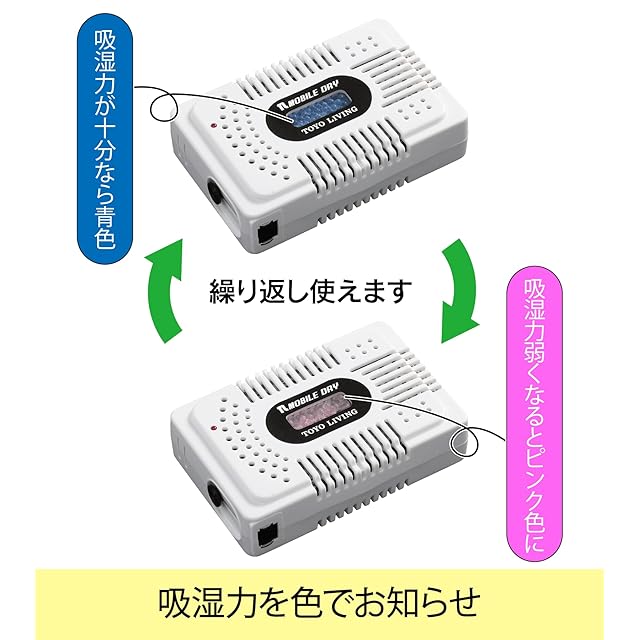 乾燥剤の吸湿状態は本体表面にある窓口からご確認いただけます。吸湿力が高い間は青色で、吸湿力が下がってくるとピンク色に変わります。