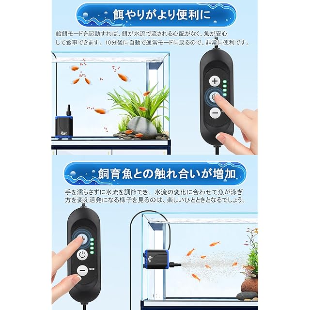 【水流ポンプとしても使用可能・コンパクト設計】 本体サイズはわずか4.8×3.6×5.3cmと非常にコンパクトで、小型水槽のレイアウトを邪魔しません。強力な吸盤が水槽壁にしっかりと固定され、ポンプを水流ポンプとして使用することも可能です。適度な水流を作ることで、魚たちがより活発に泳ぐ姿が楽しめます。コントローラーで流量を調整しながら、水流の変化を魚たちが楽しむ様子を観察できるのも魅力です。