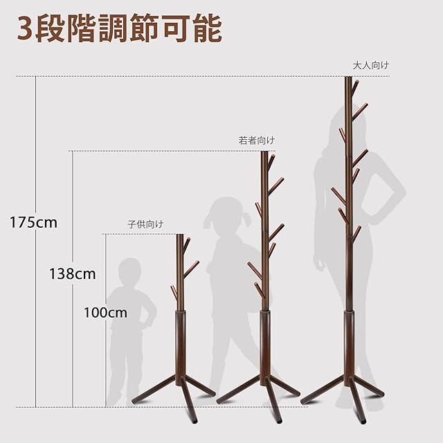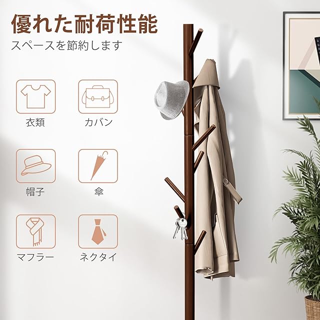ポールハンガー 木製 衣類収納 コートハンガー 洋服ラック Azaeahom 40kg耐荷重 ハンガースタンド 枝型フック設計 高さ175cm 3段高さ調節可能 フック8個 組み立て簡単 ネジ式 倒れ防止 リビング 寝室 (ブラウン)