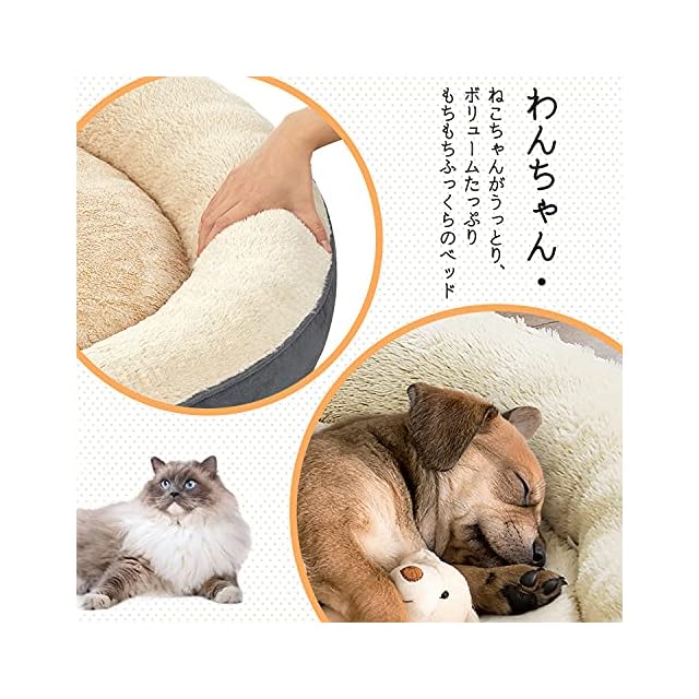 洗練されたデザイン:可愛いドーナツ型のデザインがペットの体を丸く包まれ、安心感を与えてくれます。あごのせしやすいフチともちもちのクッションが癒しの寝心地。底部の表面には滑り止めのデザインがされているので、ペットがどんなに動いても滑りにくいのがメリット