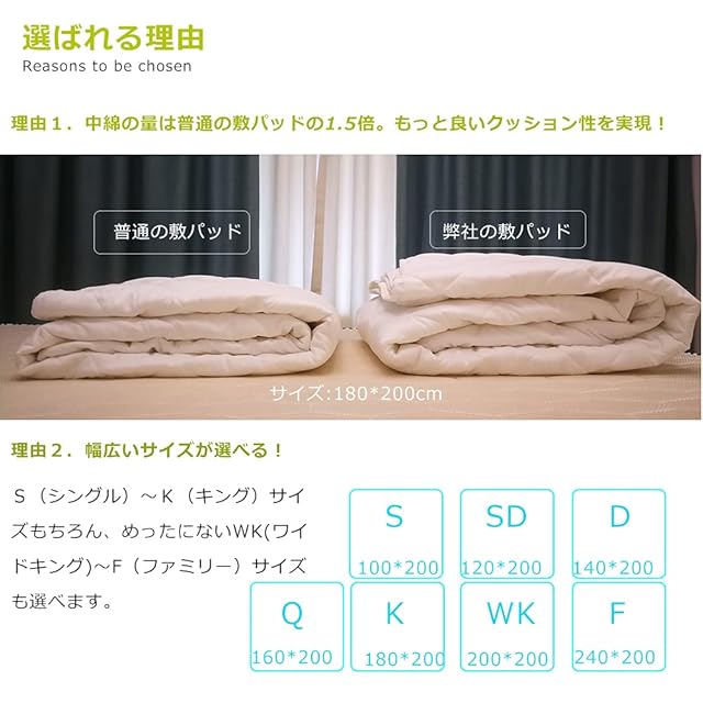 <もっと良いクッション性>:普通の敷パッドの1.5倍の中綿で充填して、ふんわり心地よい寝心地が実現できました。もっと良いクッション性と保温性が体験していただけます。