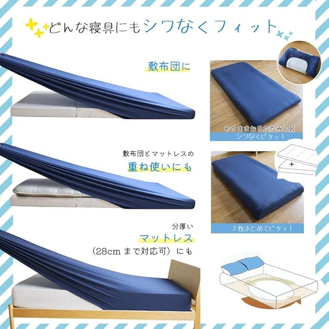 【のびる・ ピッタリフット】ベットカバーは『たて・よこストレッチ』特性を持ち、ベッドシーツ適用サイズ幅広いです。角までピタッ!シワになりにくく、ズレにくく、シーツが浮くことなく、見た目もすっきり。マットレスや敷きふとんの汚れ防止にも役立ちます。