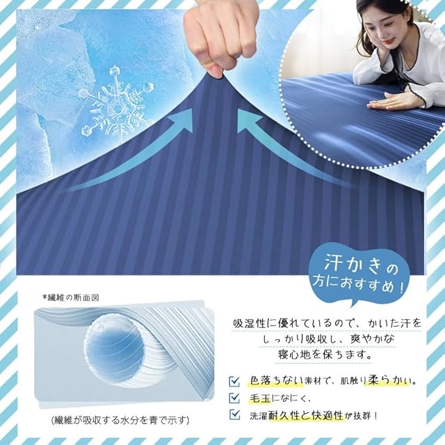 【吸水速乾・シルクタッチ】ボックスシーツの生地は柔らかくてなめらか肌に優しく仕上げました。優れた吸湿性と通気性で、汗でもベタつかないサラサラ感を保ちます。ムレにくく、真夏に快適にお休みいただけます。