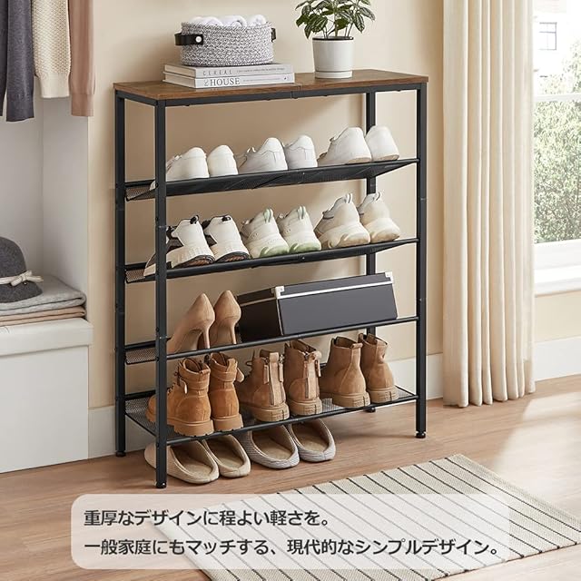 商品名:VASAGLE シューズラック 下駄箱 おしゃれ 省スペース 5段 大容量 木製 玄関収納 収納家具 シューズ 奥行28㎝ 高さ93㎝ メッシュ棚調整可能 ヴィンテージ 玄関 棚 靴収納 靴箱 通気性 ワイド オープン シンプル LBS038