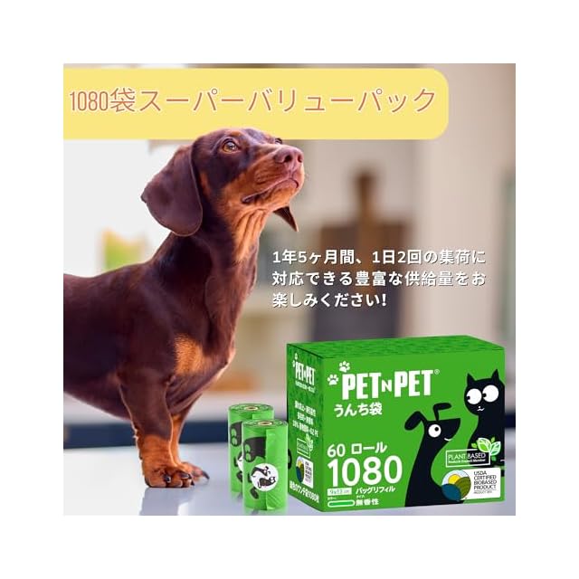 Pet N Pet うんち袋、エチケット袋、60ロール入り1080個、臭わない犬のうんち袋、犬の散歩用猫用トイレ袋、USDA認定 38% 植物由来 & 62% PE、漏れ防止で丈夫