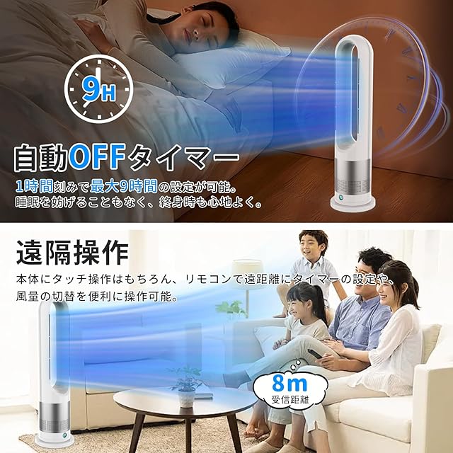 商品名:【2025新登場・冷暖兼用・羽根なし 】扇風機 タワーファン 温風 冷風 冷暖房 8段階送風&3段階温風 DCモーター 100°首振り 9hタイマー 強風&微風&静音モード 大風量 羽根なし扇風機 リモコン操作 縦型 スリムファン 転倒&過熱OFF 足元ヒーター セラミックファンヒーター 子供部屋/脱衣所/トイレ/キッチン/寝室/リビンク/書斎/ペット用 PSE認証済 日本説明書 ホワイト
