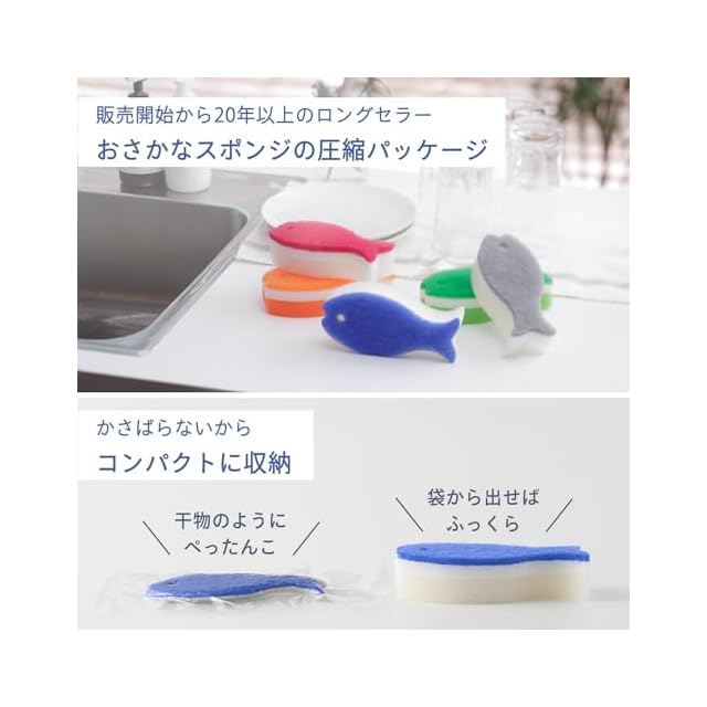 【かわいい魚型】さかなの形のデザインが可愛いカラースポンジです。目立つこと心配なく、シンクまわりにおしゃれに収納できます。子どもにも馴染みのあるデザインのため、家事の手伝いにもおすすめです。