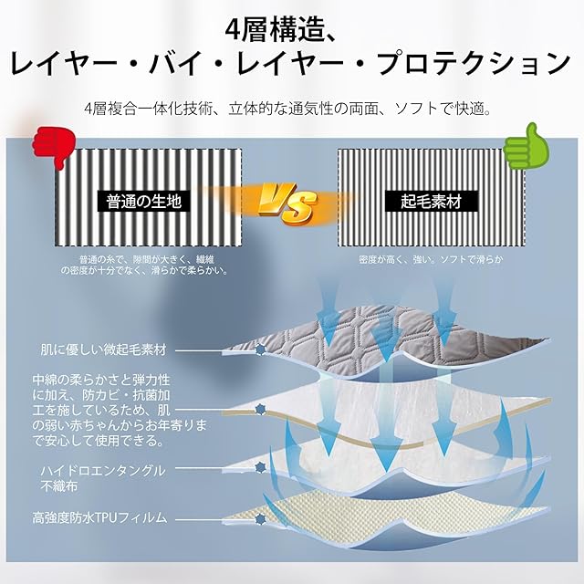 【圧倒的な防水性】:裏面には通気性の高いTPU防水膜を採用し、通常の防水膜よりも通気性が高く、粘りも強くなる。防水性を高めて、汗・水などをかけでも、マットレスに水分は到達しません,お子様のおねしょやペットのそそう、高齢者・病人などの介護用寝具を汚してしまう心配を軽減し、清潔・衛生的に保ち、心地よい眠りをサポート。