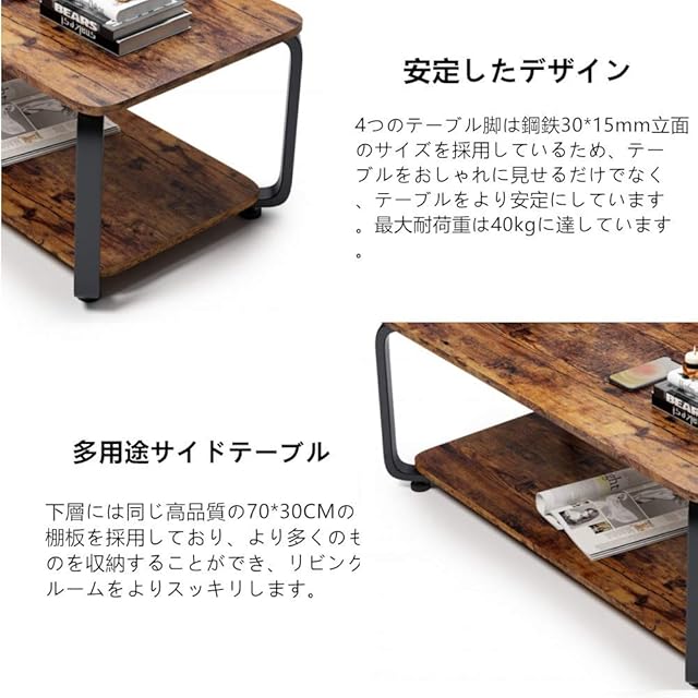 1.多用途サイドテーブル: 切創・衝突防止ため、四角にR角に仕上げられています。有効な保護が得られます。上層は80*40cmの高品質大きい天板を搭載しており、アフタヌーンティーを飲んだり、夕食を楽しんだりすることなどのすべて異なる場面に対応できます。下層には同じ高品質の70*30CMの棚板を採用しており、より多くのものを収納することができ、リビングルームをよりスッキリします。