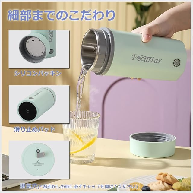 【様々な用途】Focustarポータブル電気ケトルは様々な場面で活用できます。出張先のホテル、キャンプ、病院など、様々な場所で温かい紅茶やコーヒーを楽しみたい時に、自分専用のポータブル電気ケトルが必需品です。