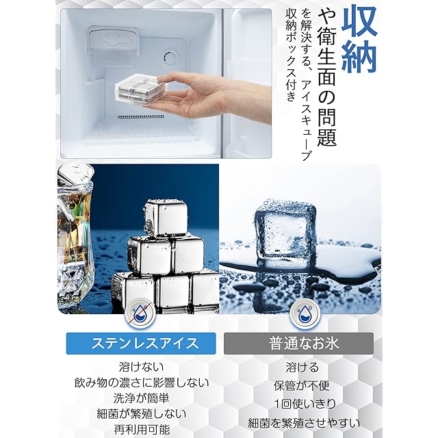 【特別なステンレス製キューブ】アイスキューブは冷凍庫で冷やして使用して、約3時間で凍ります、約200m|の液体に2~3個で約20~30分程度の保冷効果があります。従来の製氷と比べ、ステンレス製のアイスキューブは溶けて飲み物が薄まることなく、飲み物の味に影響を与えないため、あなたやご家族、ご友人と100%オリジナルのビール、ワイン、ウィスキなど飲み物を楽しむことができます。