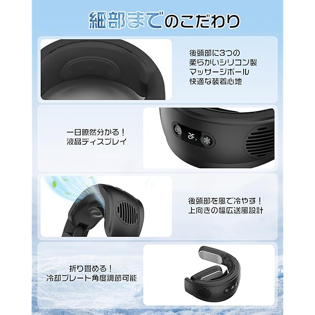 【3段階の風量と冷却を調節可能・360°立体涼風】全く新しい送風技術を採用し、2つの超強ターボファンを搭載し、1分間に6500回転の高速回転で、風量が60%増加し、熱を瞬時に吹き飛ばします。風量と冷感は、弱、中、強の3段階で自由に調整できます。使用環境や好みに合わせて簡単に風量や冷感の強さを調節できます。軽い涼しさから強い冷たい風まで。上部出風口のデザインで、涼しい空気を直接顔に届けることができます。360°立体風で全身を包み込むような冷却体験を提供。熱熱中症/化粧崩れ/汗のべたつき夏場の様々ま悩みを解消!