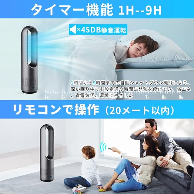 ⏰【9時間タイマー機能&低騒音】タワーファンは新しくアップグレードされたセラミックヒーターは、45dB以内の騒音で動作し、一晩中静かで暖かい環境で眠らせる超静かな機器です。タイマー機能を備え、1時間から9時間までの自動シャットダウン機能により、エネルギー効率が更に向上し、環境にも配慮します。深い眠り中でも設定通り時間に送風を停止でき、省エネには助かります。