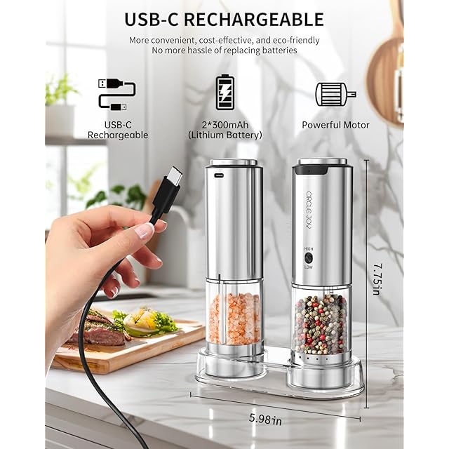 中断のない調理のための充電式の便利さ - 食事の準備中に電池が切れるのにうんざりしていませんか?当社の電動ペッパーグラインダーは、USB-C充電式バッテリーでその問題を解決します。付属のUSB-Cケーブルで差し込むだけで、あっという間に中断することなく粉砕に戻ることができます。この環境に優しい設計により、使い捨てバッテリーが不要になり、お金を節約し、無駄を減らすことができます。料理を途切れることなく味付けする喜びをお楽しみください