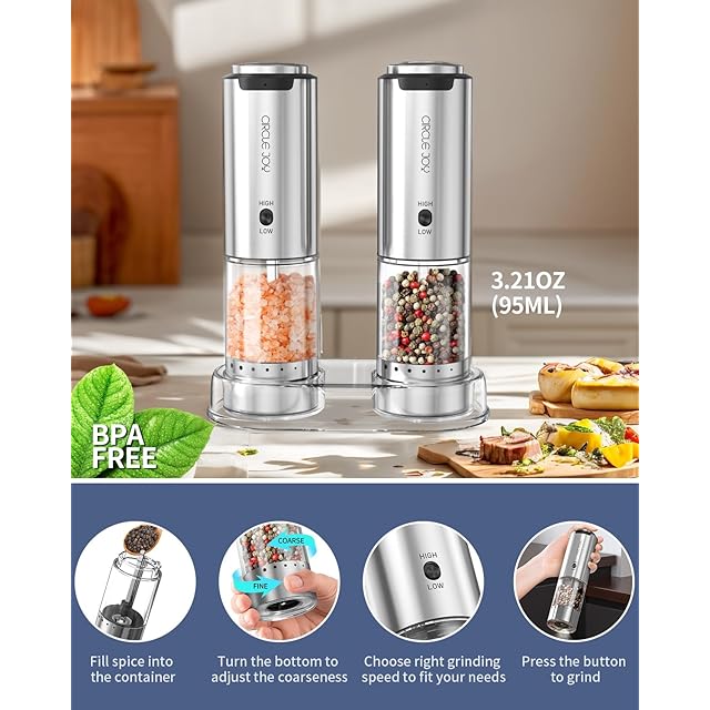 商品名:CIRCLE JOY 充電式ペッパーミル 電動 ステンレス製ペッパーミル 研削速度可変 厚さを外部で調整する 95ml容器 収納ベース 白色LEDライト 2本セット シルバー
