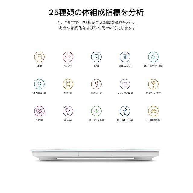 25の項目を測定可能:1回の測定で、体脂肪、筋肉量、水分含有量、タンパク質量、骨ミネラル密度などの身体組成を評価する25種類の体組成指標の分析レポートを作成できます。健康状態を詳細に分析して、あらゆる変化をすばやく簡単に特定します。ご注意:専用アプリXiaomi Homeに対応していますが、Google Fit との連携はできませんので、ご購入の際はご注意ください。