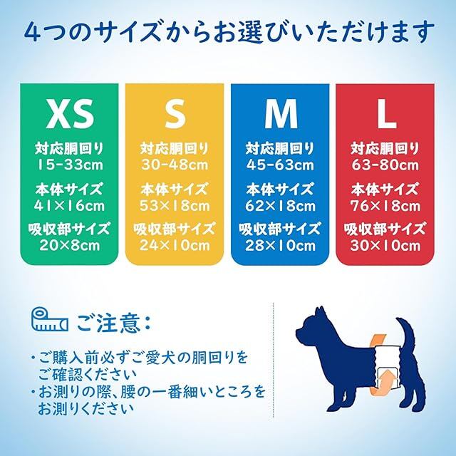 製品仕様:XS、S、M、Lの4サイズからお選びいただけます、ご購入前、必ずサイズ表で愛犬のサイズを確認してください、XS:本体1枚サイズ:約41×16cm、吸収パッドサイズ:約20x8cm、S:本体1枚サイズ:約53×18cm、吸収パッドサイズ:約24x10cm、M:本体1枚サイズ:約62×18cm、吸収パッドサイズ:約28x10cm、L:本体1枚サイズ:約77×18cm、吸収パッドサイズ:約30x10cm、留め方はマジックテープで、幅が広くて、愛犬に適切なサイズに調整できます、伸縮性の縁で、わんちゃんの動きにもピッタリフィットします