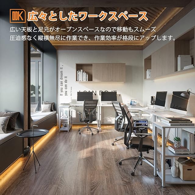 【ラック付きデスク】デスクの足元には一体型のラックが備え、本や書類などを使いたい時にサッと取り出せます。また、L字型のデザインで部屋のコーナーを最大限に活用でき、ご家庭でもオフィスでも、日常の操作に十分なスペースを確保できます。
