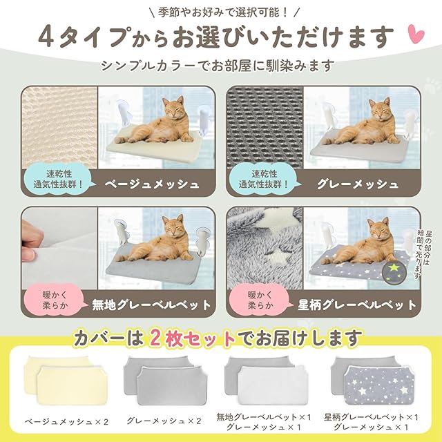猫ちゃんにうれしいこといっぱいの吸盤式ハンモック <br><br>窓の外には人や車、生き物など猫の好奇心をくすぐるものがたくさん! <br>外を眺めることで好奇心を満たしストレス解消したり、リラックスできる時間を提供します。また、ハンモックへの飛び乗りや飛び降りで運動不足を解消し、健康維持できます。 <br><br>猫はひなたぼっこが大好き! <br>日光浴をすることで体内時計を調節したり、血行がよくなることで内臓の動きが促進され毛艶がよくなるなど、猫にとって日向ぼっこは大切な時間です。また、太陽の殺菌効果で毛についた菌やウイルスを除去する効果もあります。 <br><br>交換用の布カバー付きで清潔・安心! <br>チャック式だからフレームを窓から外さず布カバーを交換できるため簡単便利です。また、洗濯可能なので、いつでも清潔に保てて長持ちします。心地よい肌触りを追求し、快適で良質な休息、睡眠を提供します。 <br><br>パーツはたったの3つだから組立簡単! <br>部品が最低限になるよう改良し、不要な組立工程を排除しました。約5分で組み立て可能です。 <br><br>スペースを有効活用! <br>猫タワーと違い、窓に貼り付けることができるので、場所を選ばず設置可能です。また、複数のハンモックを段違いに設置することでキャットウォークのようにすることもできます。不要な時は折りたたみ収納可能です。 <br><br>オールシーズン使える猫ベッドハンモック! <br>速乾性のあるメッシュ生地と暖かく柔らかい肌触りのベルベット生地の2種類があり、季節やお部屋の雰囲気、愛猫の好みに合わせて2枚お選びいただけます。 <br><br>ロープなしのほうがねこちゃんは自由にくつろげます! <br>【コードありハンモックと比較した、この商品のメリット】 <br>広く自由に遊べるため、猫同士で戯れることができる。 <br>ロープがないため出入りの支障なし。 <br>ハンモックの安定性が高い。 <br>見た目がすっきり。 <br><br>【コードありハンモックのデメリット】 <br>左右にロープがあるため圧迫感があり、移動の妨げになる。 <br>揺れやすく、不安定。 <br>ロープが長いため設置には大きな窓が必要。 <br>愛猫がロープを噛んでしまう危険性がある。 <br><br>直径8.5cmの超大型吸盤! <br>【吸盤の使い方】 <br>1 使用前に85~100℃のお湯に10秒程度浸して、吸着力を高めます。 <br>2 ウェットティッシュで吸盤と接触する窓ガラスをきれいに拭きます。 <br>3 空気が入らないよう4つの吸盤の真ん中に両面テープを貼ります。 <br>4 吸盤内の空気を抜くように窓ガラスに張り付け、数分放置し乾かしてから使用してください。 <br><br>【変形した吸盤の復元方法】 <br>1 吸盤を85~100℃のお湯に入れ、3~5分浸けてください。 <br>2 吸盤を取り出し、机の上に平らに置き、常温になるまで吸盤を冷まし、水分をふき取ると元の形状に戻ります。