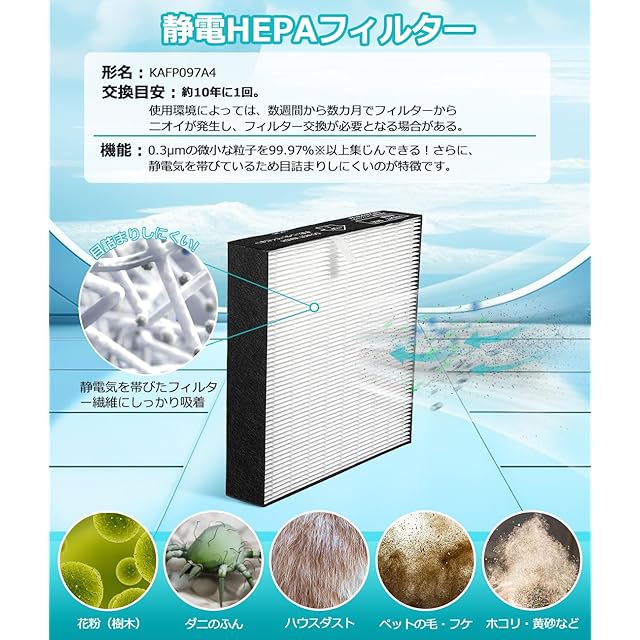 【交換の目安】約10年。空気清浄機をピーク性能で動作させるためには、正しいタイミングにフィルターを交換してください。 ※ご使用の時間や環境により、フィルターの寿命が違います。特にペットちゃんを飼っている家庭では、交換時間を短縮することをお勧めします。