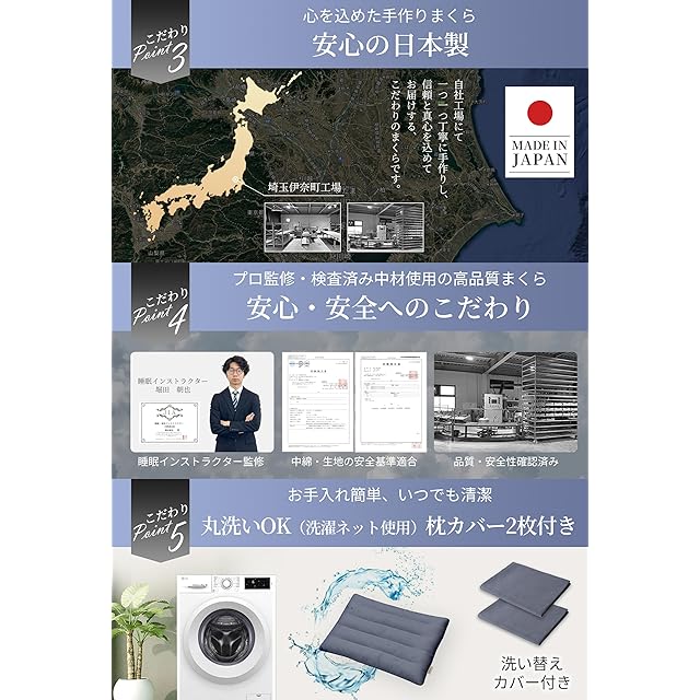 【安心の日本製 まくら】日本国内で製造されたこの枕 は、高い品質基準をクリアしています。安心の日本製で、耐久性と快適性を兼ね備え、末永くお使いいただける優れた製品です。