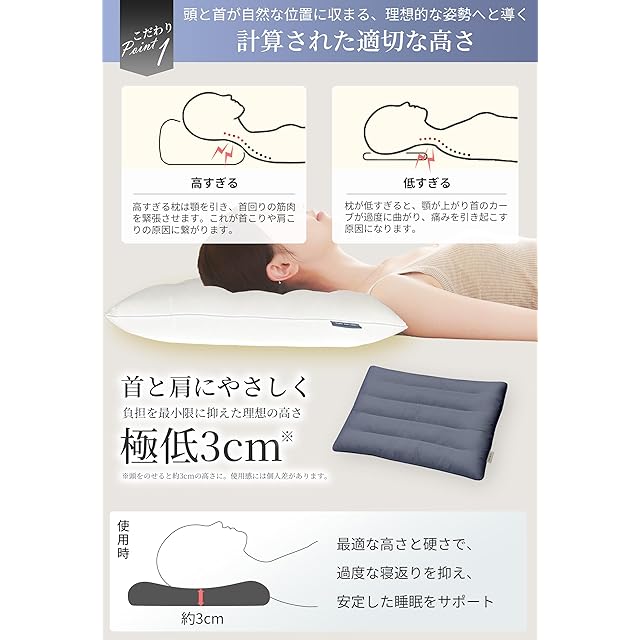 【極めた低さと独自のカーブ設計】頭をのせるとたったの3cmの高さになる低め 枕 で、首や肩に余分な負担をかけず、スムーズに寝返りを打つことができます。また、高さとカーブのデザインを選択できるため、自分の首にぴったりの薄い枕として使用することが可能です。