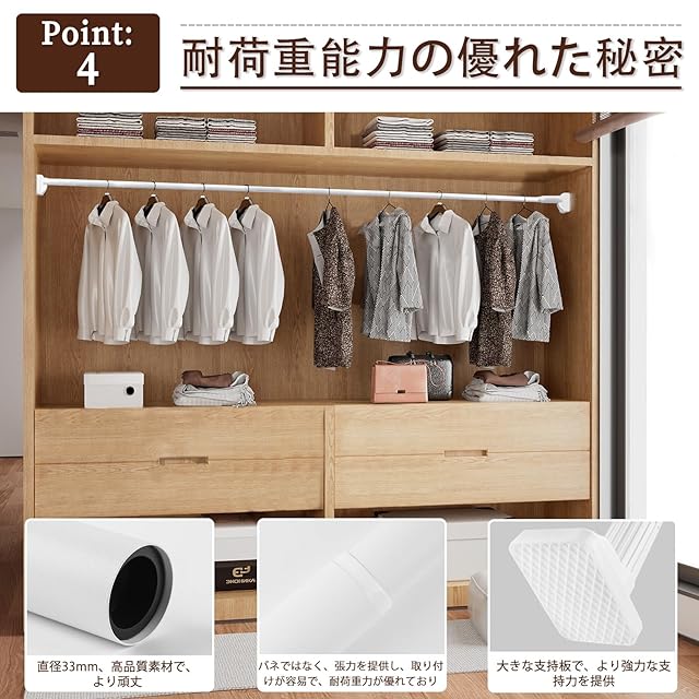 この突っ張り棒は、新しい防滑技術により、地面や壁面にしっかり固定されます。バネがないため、設置も簡単で力を使いません。直径33mmの厚いスチール製で、110-200cmの長さに調節可能です。最低30kgから最大80kgの重量に対応しており、壁面材質や設置時の完成度により、設置時の締め付け具合によって承重能力が向上します。ABS材質の壁面接触部分を採用し、壁に傷をつける心配がありません。霧面塗装が施され、錆びを防ぎます。強力な接着剤が不要なので、設置後に残る跡もありません。また、ネジや釘を使わずに設置できるため、壁面にダメージを与える心配もありません。誰でも簡単に設置できるだけでなく、デザイン性も高く、おしゃれな室内空間を演出することができます。是非、高性能で使い勝手の良い突っ張り棒を手軽に体感してみてください。