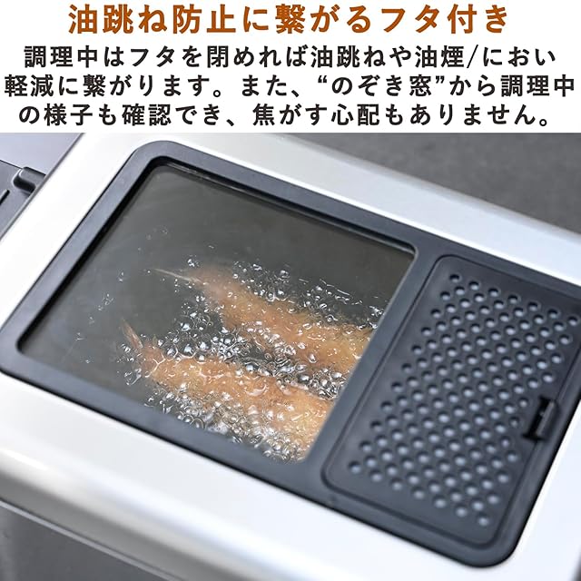 【便利な油切り網付き】小さな食材を揚げるときに便利な「油切り網」が付属しています。本体のくぼみに取っ手がフィットするので、油切り網をセットした状態でふたを閉じて調理が可能です。調理後はそのまま油切り網を使用して揚げ物を取り出せます。
