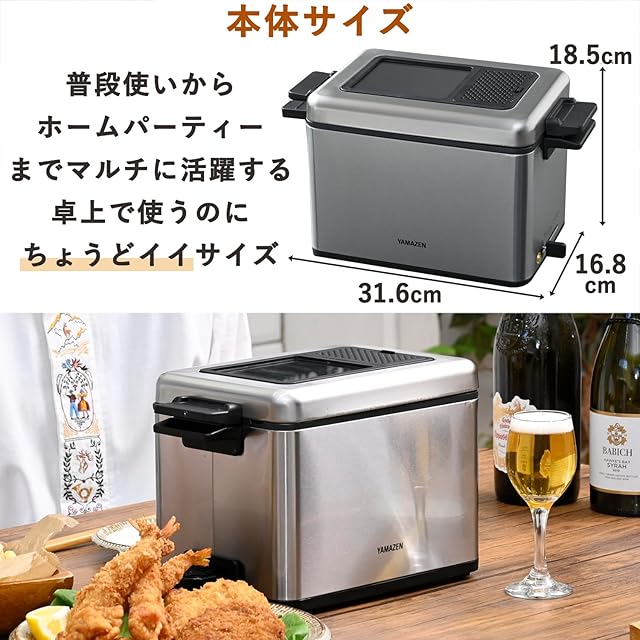[山善] フライヤー 家庭用 電気フライヤー 卓上 865ml 「少ない油で揚げられる/使用油量約40%削減」 温度調節機能 1000W ローオイルフライヤー 油切り網付き シルバー YAG-L100(S)