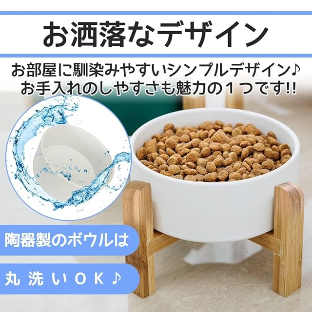 高さを出すことで首への負担を抑え、食事のしやすさを大幅アップします。大口に設計した深さのある陶器製のボウルにより、フードの食べこぼしを防ぎます。飲み水やウェットフードにもお使いいただけます。
