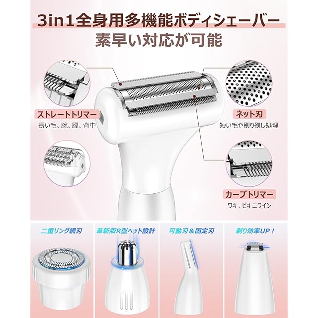 【3in1シェービングヘッド&超强力モーター】フレックスのネット刃、極薄綱目構造の直線刃と弯状刃が一体となった3IN1シェーバーは、ほとんどの肌タイプに最適です。ネット刃は刃面が広く、太ももや手など広い範囲または剃り残しに、直線刃は胸やすねなどに適用、弯状刃は弧度をを持ち、脇、頸など剃りにくい部分により良いフィットします。毎分7200回の超高速モーターが搭載するが毛を挟むことはなく、更に低アレルギー性ステンレス刃を採用し、効率の面で大幅に向上、初心者にとって扱いやすく、忙しい朝に最も手間のかからないレディースシェーバーとなります。