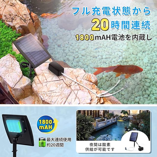 【どうして選んだの、ZHHMlソーラーエアポンプ】太陽光を使用し、電線を接続する必要がなく、魚や水耕植物にとって安全です。2200 mAhバッテリを内蔵し、雨や曇りの日でも72時間の作業時間を提供します、ZHHMlソーラーエアポンプにより、水槽に酸素が供給されることがされます。