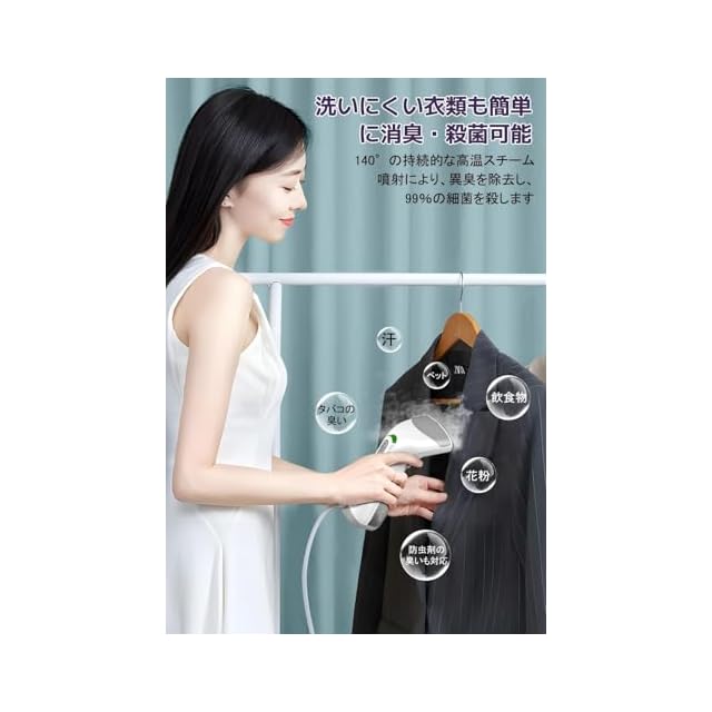 さまざまな生地の殺菌、脱臭に適しています:シルク、コットン、ウール、リネン、その他の生地などのあらゆる種類の衣類に使用でき、しわを簡単に取り除くことができます。繰り返し使用しても衣類を傷つけることはなく、衣類の質感を長持ちさせます。140°の高温で直接スチームすることで、除菌、煙や汗の臭さや、衣類に付着した虫や花粉を取り除くことができます。