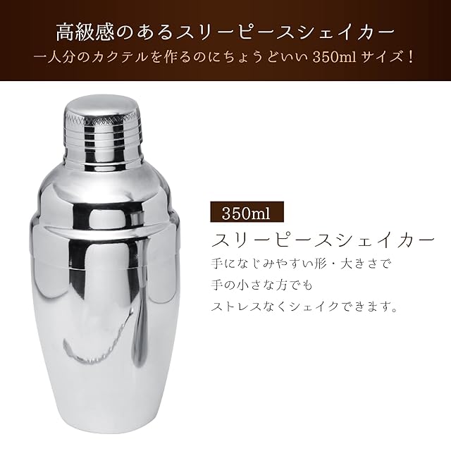 【初心者・入門者向けカクテルシェイカー3点セット】 はじめてカクテルシェイカーを手に取られる方でもご安心してご利用いただけるように、 下記の内容にてお届けします。 ・350ml カクテルシェイカー ・45ml/30ml 目盛りつきメジャーカップ ・27cm バースプーン ・イラストつき日本語説明書 ・カクテルレシピカード