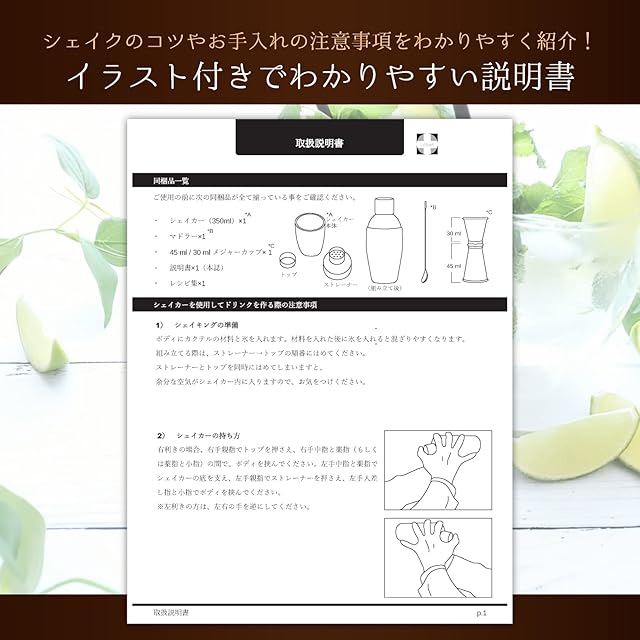 ・シェイクやお手入れの注意事項をわかりやすく解説したイラスト付きの説明書があるので安心!