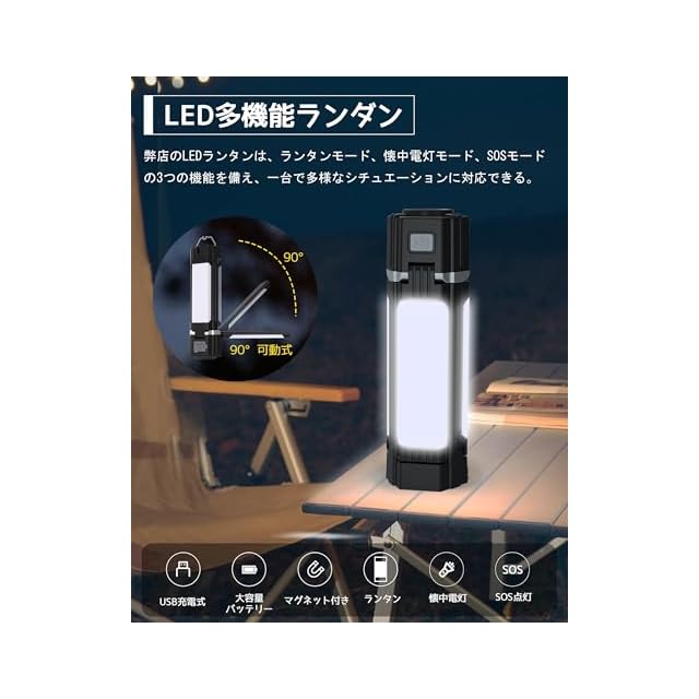 【多機能・1台3役・360°高輝度・ LED提灯】当社の LEDランタン は、ランタンモード、懐中電灯モード、緊急SOSモードの3つの機能を備え、一台で多様なシチュエーションに対応できる ランタン となり、昼白色の高輝度で、キャンプや夜釣り、登山などのアウトドア活動はもちろん、非常時のSOSサインとしても役立ちます。全方位を照らす360°照明で、どこにいても明るい環境を確保する led ランタン です。