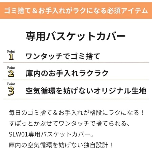 【よくある質問】 Q.ビニールやネットなどで代用できますか? A.内部の乾燥効率が悪くなり、故障の原因になるので他のもので代用はできません。ビニールなど別のものをバスケットにかぶせて使うと、空気循環に支障をきたし水分が内部に流れ込むなど故障の原因になります。専用カバーを使用しない場合は、そのまま何もつけずに処理してください。 Q.カバーがないと使えませんか? A.専用カバーがなくても本体の使用は可能です。お手入れやゴミ捨ての手間が減らせるため、多くのお客様にご利用いただいています。 Q.普通の不織布と何が違いますか? A.loofenの機能の特徴である「空気循環」を妨げないよう設計されたオリジナル素材です。日々のお手入れやごみ捨てが簡単になるだけでなく、しっかり乾燥させることができます。