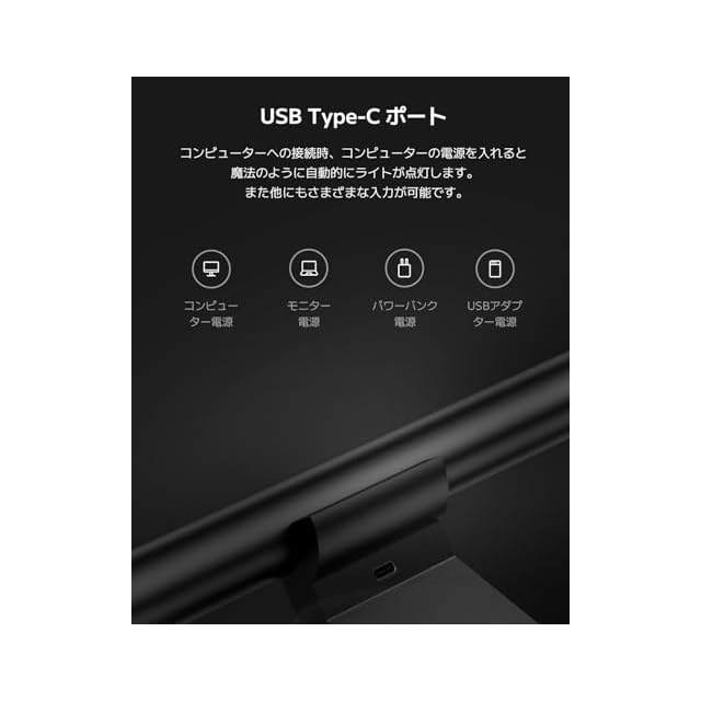 【USB Type-Cポート】コンピューターへの接続時、コンピューターの電源を入れると魔法のように自動的にライトが点灯します。また他にもさまざまな入力が可能です。