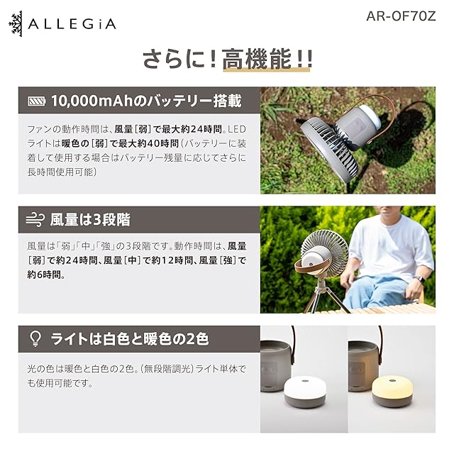 ■風量3段階 強/中/弱 ■LEDランタン最大60h